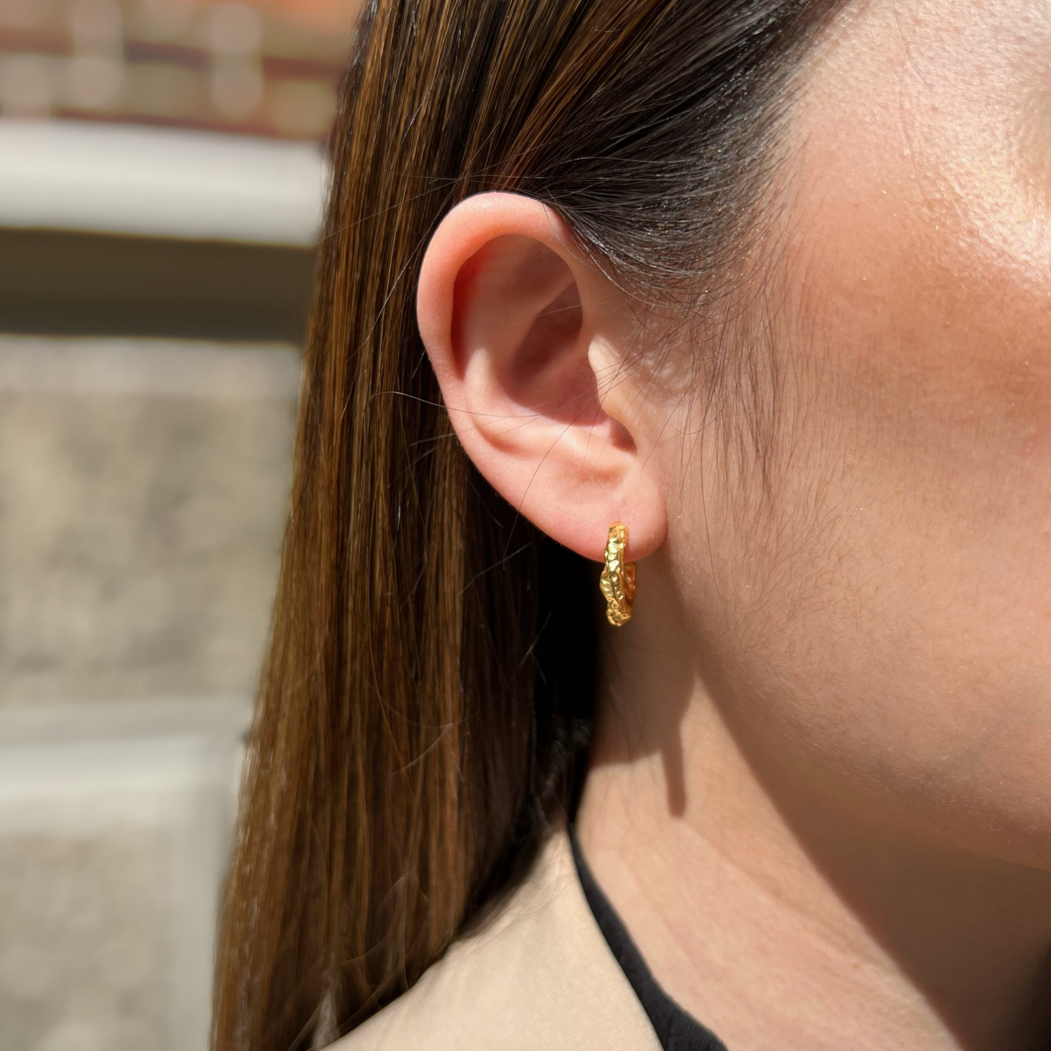 Our LUCIA earrings have a melted texture that instantly catches the eye. The beautiful earrings can create a new expression for an everyday look, and can be combined with other earrings to create a contrasting look.